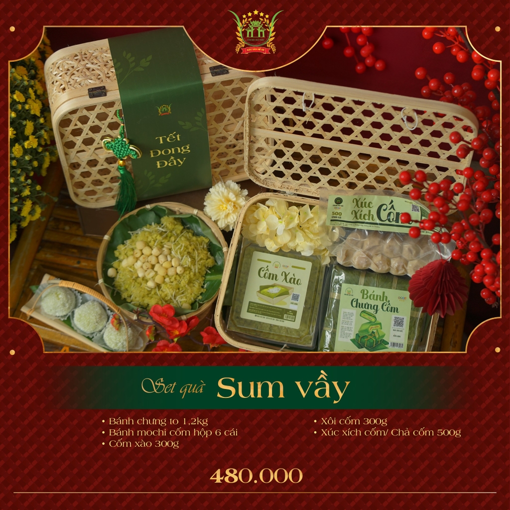 Set quà Tết Sum Vầy là sự kết hợp hài hòa giữa nhiều món ăn truyền thống được làm từ cốm non và các nguyên liệu quen thuộc của ẩm thực Bắc Bộ. Không cầu kỳ trong hình thức, mỗi set quà hướng tới giá trị cốt lõi: hương vị tự nhiên, sự chỉn chu trong lựa chọn và ý nghĩa gắn kết trong ngày Tết.